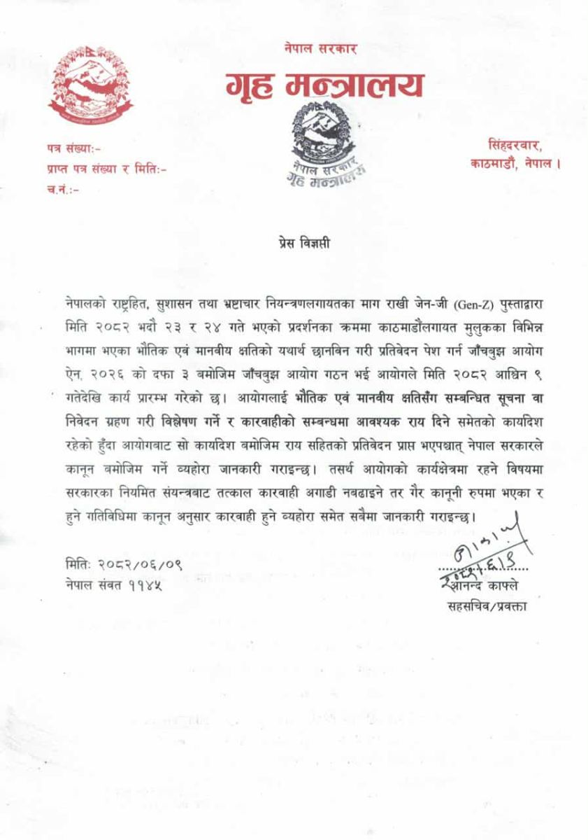 प्रहरीको असन्तुष्टिपछि गृह मन्त्रालयले २०८२ असोज ९ गते एक विज्ञप्ति जारी गर्दै घटनाको छानबिन गर्न न्यायिक आयोग गठन भएकोले आयोगको प्रतिवेदनपछि मात्रै कारबाही हुने भन्दै तत्काल कारबाही अघि नबढाउने सूचना समेत जारी गरेको छ । गृहले सूचना नै निकालेर लुटपाट, तोडफोड र आगजनी गर्नेलाई तत्काल संरक्षणमा राख्ने देखेपछि अपराधि पक्राउमा लागेका प्रहरी भने ट्वाँ परेका छन ।