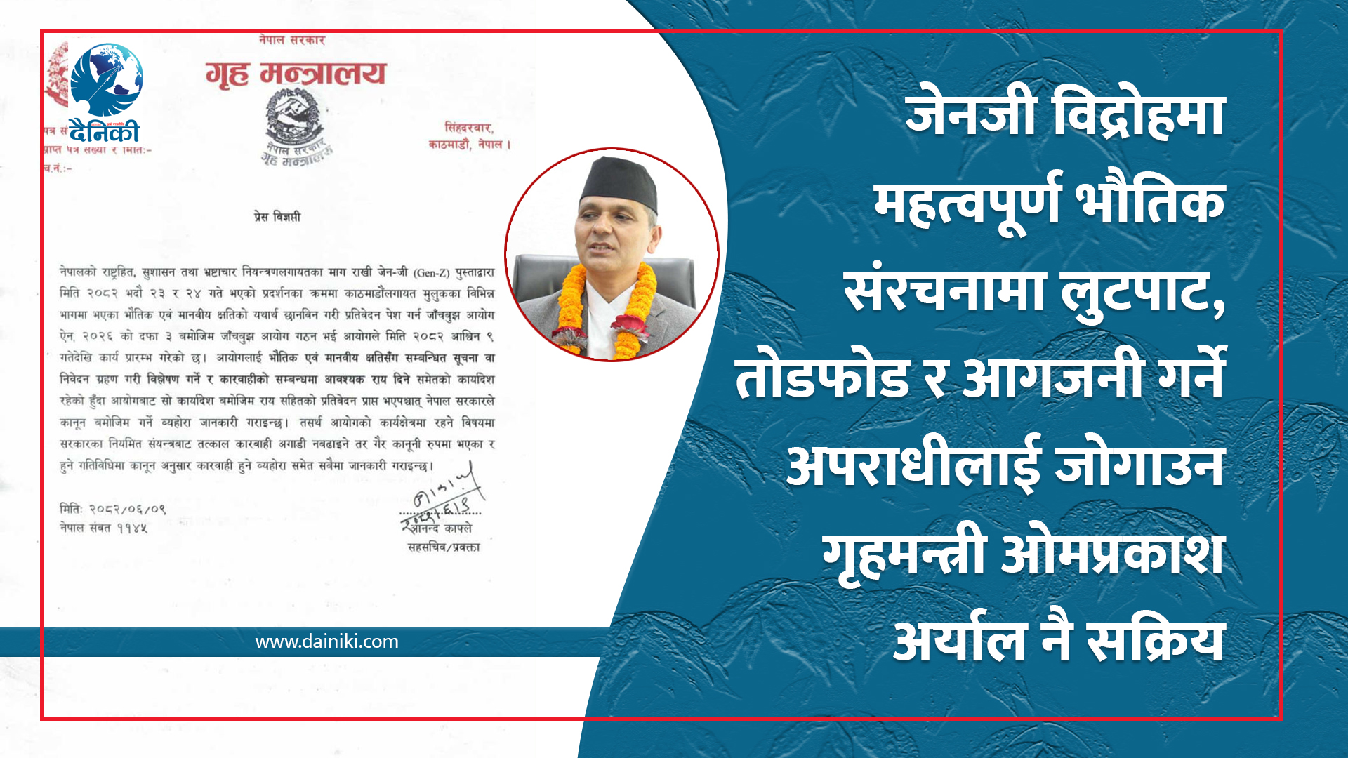 १२ असोज, काठमाडाैँ । जेनजी पुस्ताको विद्रोहको जगमा उभिएको सरकारले महत्वपूर्ण भौतिक संरचनामा लुटपाट, तोडफोड र आगजनी गर्ने अपराधीलाई जोगाउन अभियान चलाएको पाइएको छ । छानविन समितिको नाममा गृहमन्त्री ओमप्रकाश अर्यालले पक्राउ परेकाहरूलाई छाड्न निर्देशन दिएको पाइएको छ ।