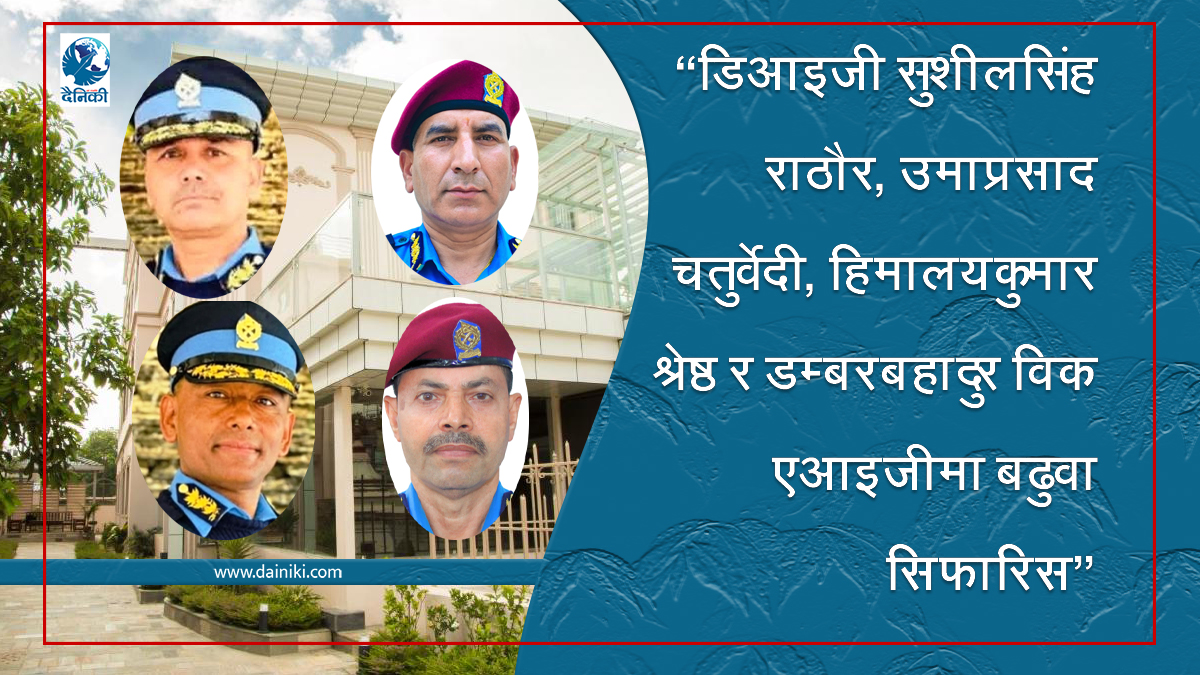 गृह मन्त्रालय बढुवा समिति, सचिवालयको आज बसेको बैठकले जनपद प्रहरी समूहतर्फका डिआइजी सुशीलसिंह राठौर, उमाप्रसाद चतुर्वेदी, हिमालयकुमार श्रेष्ठ र डम्बरबहादुर विकलाई एआइजीमा बढुवा सिफारिस गरेको हो ।