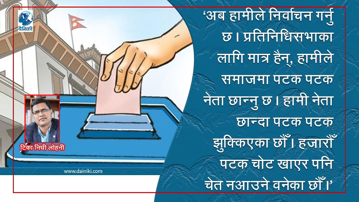 अब हामीले निर्वाचन गर्नु छ । प्रतिनिधिसभाका लागि मात्र हैन्, हामीले समाजमा पटक पटक नेता छान्नु छ । हामी नेता छान्दा पटक पटक झुक्किएका छौँ । हजारौँ पटक चोट खाएर पनि चेत नआउने वनेका छौँ । ठूलाठूला कुरा गरेर ठूलाठूला कुरा मात्र हुन्छन् । ठूलाठूला काम हुँदैनन् । आधारभूत ठाउँबाट कुरा सुरु गर्न आवश्यक छ । अक्सर हाम्रो नेता छान्ने चलनहरूलाई ध्यानमा राख्दै यो लेखमा हामीले आउँदो प्रतिनिधि सभा वा अन्य कुनै सार्वजनिक पदमा नेतृत्व छान्दा ध्यान दिनुपर्ने सात वटा विषयमा चर्चा गरेको छु । मलाई थाहा छ, यो कुरा तपाईँलाई पनि थाहा छ । मैले तपाईँको विश्वासलाई थप बलियो बनाउनका लागि मात्र यो कुरा चर्चा गर्दै छु । अनि हुन त हो, तर कहाँ यस्ता सोझा कुरा गरेर हुन्छ भन्ने तपाईँलाई लागिरहेको छ भने चाहिँ एक एक गरेर विश्वास बढाउँदै लैजाने हो भन्नका लागि र तपाईँको आत्मविश्वास बढाउनका लागि यो चर्चा गर्दै छु । तपाई र मैले नेता छान्दा यसमा विश्वास गरौँ । अनि तपाई र मेरा साथीहरूलाई भनौँ । उनीहरूले यसलाई पालना गर्नेछन् । एकाएक जनाले प्रयोग गरेपछि यो विश्वास व्यापक बन्छ । हाम्रो चलन बन्छ । त्यसरी नेता छान्दा हाम्रो नेतृत्व तुलनात्मक रूपमा असल र प्रभावकारी बन्न सक्छ ।