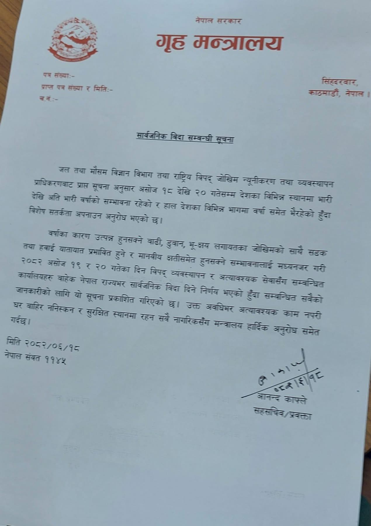 गृह मन्त्रालयले आज सूचना जारी गरी वर्षाका कारण उत्पन्न हुनसक्ने बाढी, डुबान, भू–क्षयलगायत जोखिमका साथै सडक तथा हवाई यातायात प्रभावित हुने र मानवीय क्षतिसमेत हुनसक्ने सम्भावनालाई दृष्टिगत गरी भोलि आइतबार र पर्सी सोमबार देशभर सार्वजनिक बिदा दिने निर्णय भएको बताएको हो ।