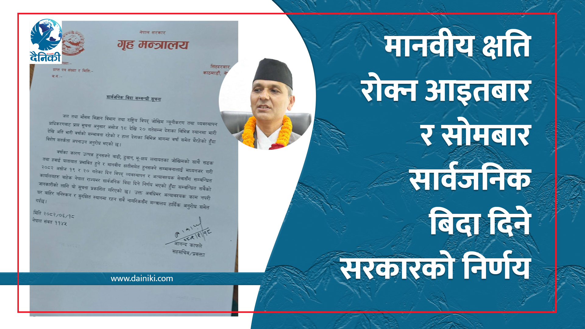 मानवीय क्षति रोक्न आइतबार र सोमबार सार्वजनिक बिदा