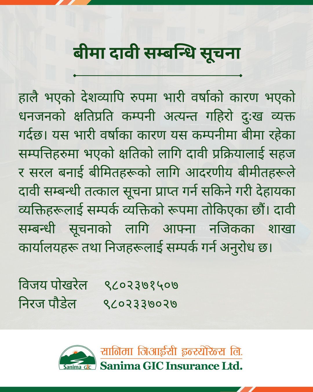 २० असोज, काठमाडौं । सानिमा जिआइसी इन्स्योरेन्स लिमिटेडले हालै देशव्यापी रुपमा भएको अविरल वर्षाले बीमा गरिएका सम्पत्तिको क्षति भएमा शीघ्र दावी गर्न बीमितलाई आग्रह गरेको छ । कम्पनीले सोमबार एक सूचना जारी गर्दै सानिमा जिआइसी इन्स्योरेन्समा बीमा रहेका सम्पत्तिहरुमा भएको क्षतिको दावी निवेदन दिन आग्रह गरेको हो ।