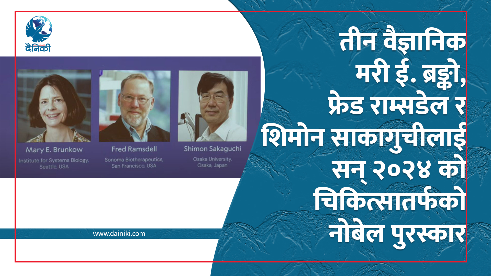 २० असोज, काठमाडौँ । तीन वैज्ञानिकलाई सन् २०२४ को चिकित्सातर्फको नोबेल पुरस्कार प्रदान गरिने भएको छ । स्टकहोमस्थित क्यारोलिन्स्का इन्स्टिच्युटको प्यानलले शरीरको प्रतिरक्षा प्रणालीबारे अनुसन्धान गर्ने तीन वैज्ञानिकलाई नोबेल पुरस्कार प्रदान गर्ने निर्णय गरेको हो ।