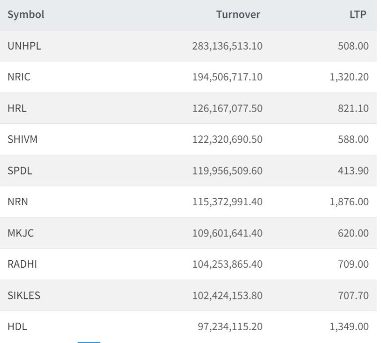 यस दिन युनियन हाइड्रोपावरको सर्वाधिक कारोबार भएको छ । कम्पनीको यस दिन २८ करोड ३१ लाख रुपैयाँको कारोबार भएको हो । त्यस्तै, यस दिन नेपाल रिको १९ करोड ४५ लाख रुपैयाँ, हिमालयन रिको १२ करोड ६१ लाख रुपैयाँ र शिवम् सिमेन्टको १२ करोड २३ लाख रुपैयाँको कारोबार भएको छ।
