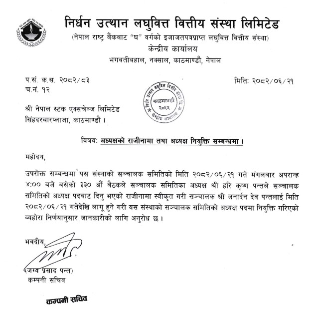 २२ असोज, काठमाडौं । निर्धन उत्थान लघुवित्त वित्तीय संस्था लिमिटेडको अध्यक्षमा जर्नादन देव पन्त नियुक्त हुनुभएको छ । असोज २१ गते बसेको कम्पनीको सञ्चालक समितिको बैठकले पन्तलाई सञ्चालक समितिको अध्यक्षमा नियुक्त गर्ने निर्णय गरेको हो ।