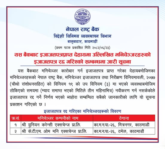 २३ असाेज, काठमाडौं । नेपाल राष्ट्र बैंकले इजाजतपत्रप्राप्त दुई मनिचेञ्जरहरूको लाइसेन्स रद्द गरिदिएको छ। राष्ट्र बैंकले काठमाडौंको मित्रनगरमा रहेको युनियन करेन्सी एक्सचेन्ज प्रा. लि. र काठमाडौंकाे ठमेलमा रहेको के.टी.एम. ओम मनि एक्सचेन्ज प्रा. लि. को लाइसेन्स रद्द गरेको हो।