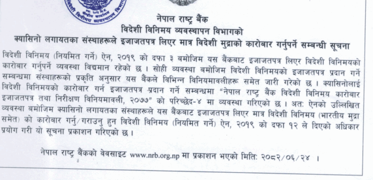 सूचनामा भनिएको छ, ‘नेपाल राष्ट्र बैंक विदेशी विनिमय कारोबार इजाजतपत्र तथा निरीक्षण विनियमावली, २०७७’ को परिच्छेद–४ अनुसार क्यासिनोलाई विदेशी मुद्रा कारोबारको इजाजत प्रदान गर्ने व्यवस्था गरिएको छ ।’