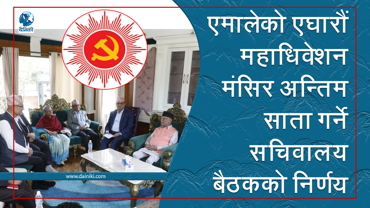 २६ असोज, काठमाडौं । नेकपा (एमाले)को एघारौं महाधिवेशन मंसिर अन्तिम साता गर्ने निर्णय गरेको छ । आइतबार सकिएको केन्द्रीय सचिवालय बैठकले मंसिर अन्तिम साता महाधिवेशन गर्ने निर्णय गरेको उपमहासचिव प्रदीप ज्ञवालीले जानकारी दिनुभयो ।