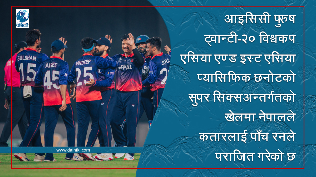 २८ असोज, काठमाडौँ । ओमानमा जारी आइसिसी पुरुष ट्वान्टी-२० विश्वकप एसिया एण्ड इस्ट एसिया प्यासिफिक छनोटको सुपर सिक्सअन्तर्गतको आफ्नो दोस्रो खेलमा नेपालले कतारलाई पाँच रनले पराजित गर्दै विजयी भएको छ ।