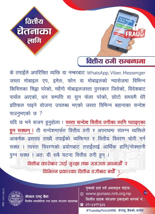 वित्तीय कारोबार गर्दा सुरक्षा तथा सजगता अपनाउन र विभिन्न प्रकारका वित्तीय ठगीबाट बच्न राष्ट्र बैंकले आग्रह गरेको छ ।