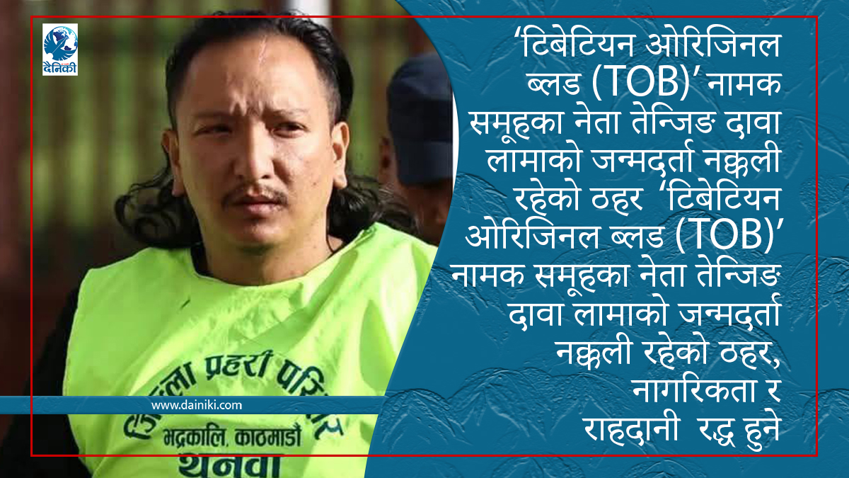 १ कात्तिक, काठमाडौँ । ‘टिबेटियन ओरिजिनल ब्लड (TOB)’ समूहका नेता तेन्जिङ दावा लामाको जन्मदर्ता नक्कली रहेको ठहर भएको छ । काठमाडाैँ महानगरपालिका वडा नम्बर ६ का अध्यक्ष भुवन लामाले यसको पुष्टि गर्नुभएको छ ।