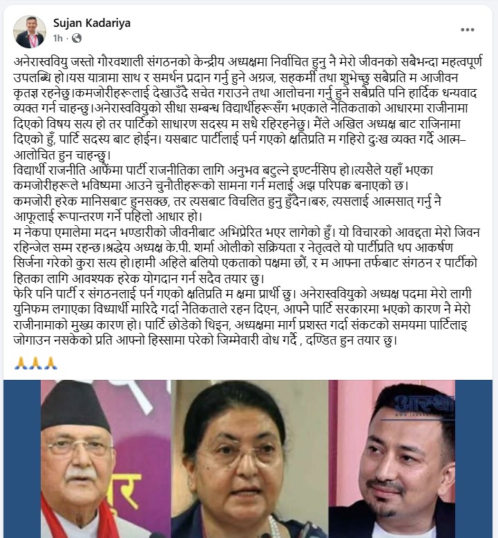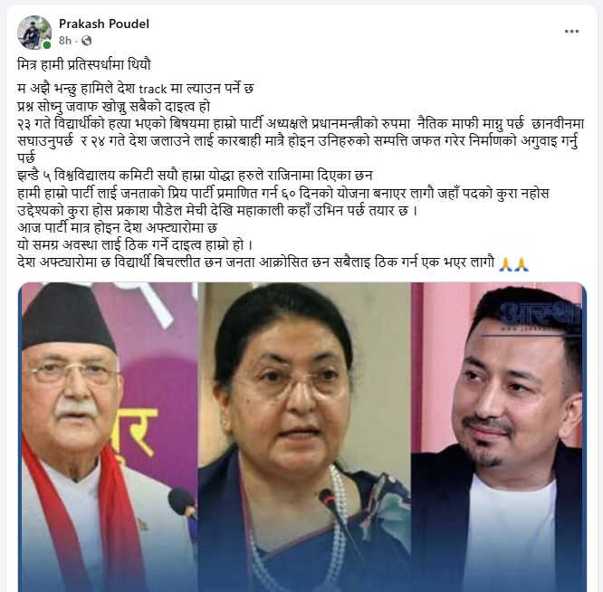 पौडेलले ओली सरकारले युवा विद्यार्थीको हत्या गरेपछि अनेरास्ववियुका पाँच विश्वविद्यालय कमिटी र सयौँ नेता कार्यकर्ताले जिम्मेवारीबाट राजिनामा दिएको समेत उल्लेख गर्नुभएको छ । यही विषय सेयर गर्दै पौडेलले फेसबुकमा यस्तो टिप्पणी राख्नुभएको छ,