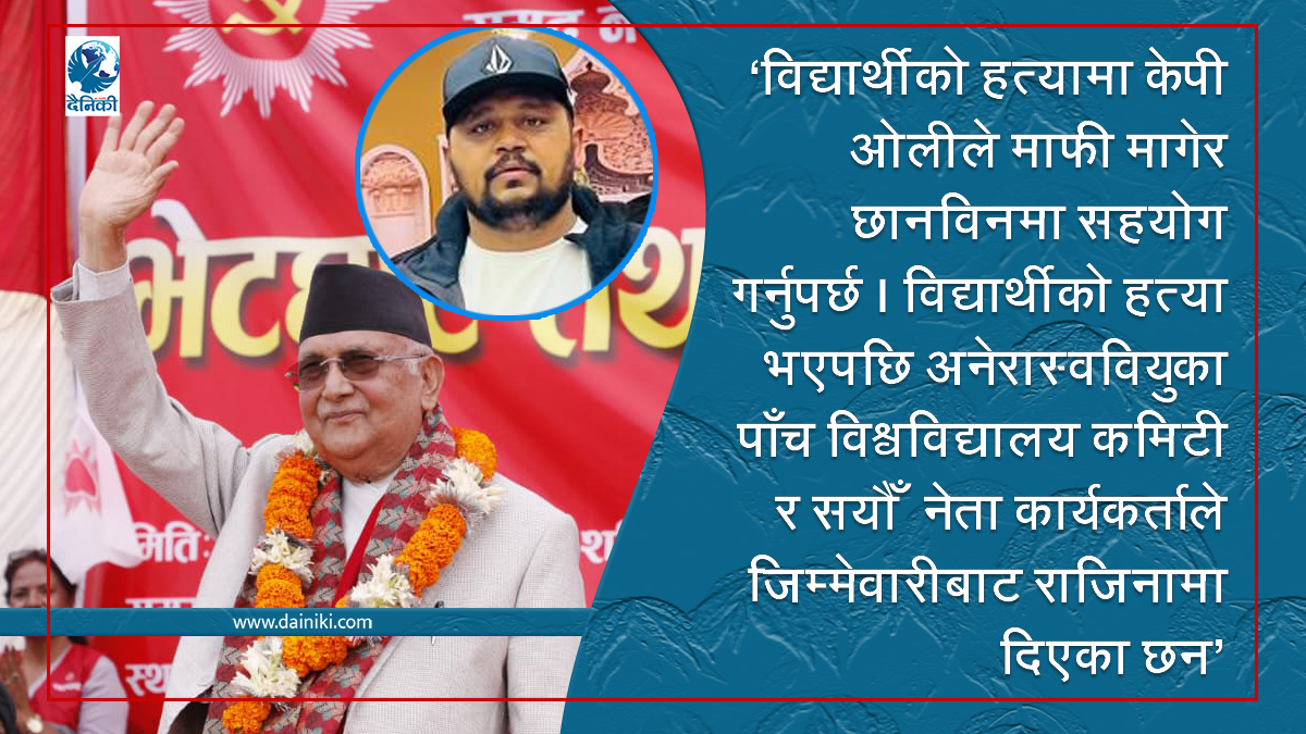 २ कात्तिक, काठमाडौँ । नेकपा एमालेका नेता प्रकाश पौडेलले भदौ २३ गते भएको हत्यामा तत्कालीन प्रधानमन्त्री समेत रहेका पार्टी अध्यक्ष केपी शर्मा ओलीले माफी माग्नुपर्ने बताउनुभएको छ । समाजिक सञ्जाल फेसबुकमा अनेरास्ववियुका अध्यक्ष डा सुजन कडरियाले ‘युनिफम लगाएका विध्यार्थी मारिदै गर्दा अनेरास्ववियुको अध्यक्षमा रहन नैतिकताले नदिएको’ भनेर लेखेको टिप्पणी सेयर गर्दै पौडेलले ओलीले माफी मागेर छानविनमा सहयोग गर्नुपर्ने बताउनुभएको हो ।