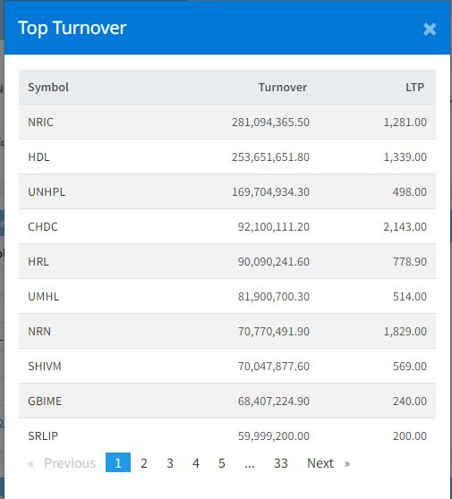 यस दिन नेपाल रिको सर्वाधिक कारोबार भएको छ । कम्पनीको यसदिन २८ करोड १० लाख रुपैयाँको कारोबार भएको छ । त्यस्तै, यस दिन हिमालयन डिष्टिलरीको २५ करोड ३६ लाख रुपैयाँ, युनियन हाइड्रोपावरको १६ करोड ९७ लाख रुपैयाँ, सीईडीबी होल्डिङ्सको ९ करोड २१ लाख रुपैयाँ, हिमालयन रिको ९ करोड रुपैयाँ र युनाइटेड मोदी हाइड्रोपावरको ८ करोड १९ लाख रुपैयाँको कारोबार भएको छ ।