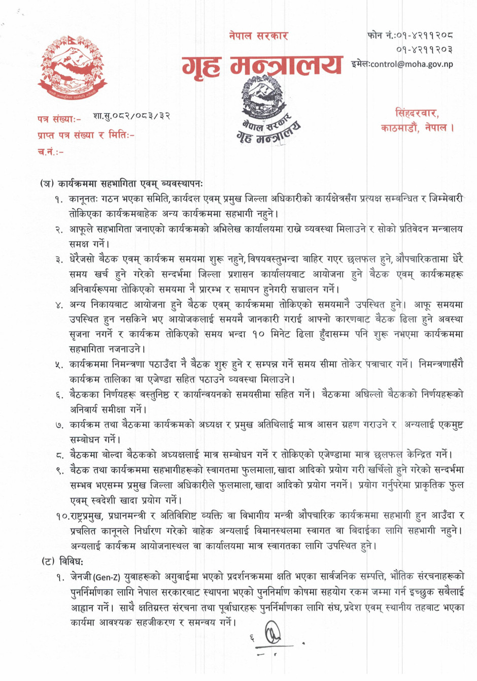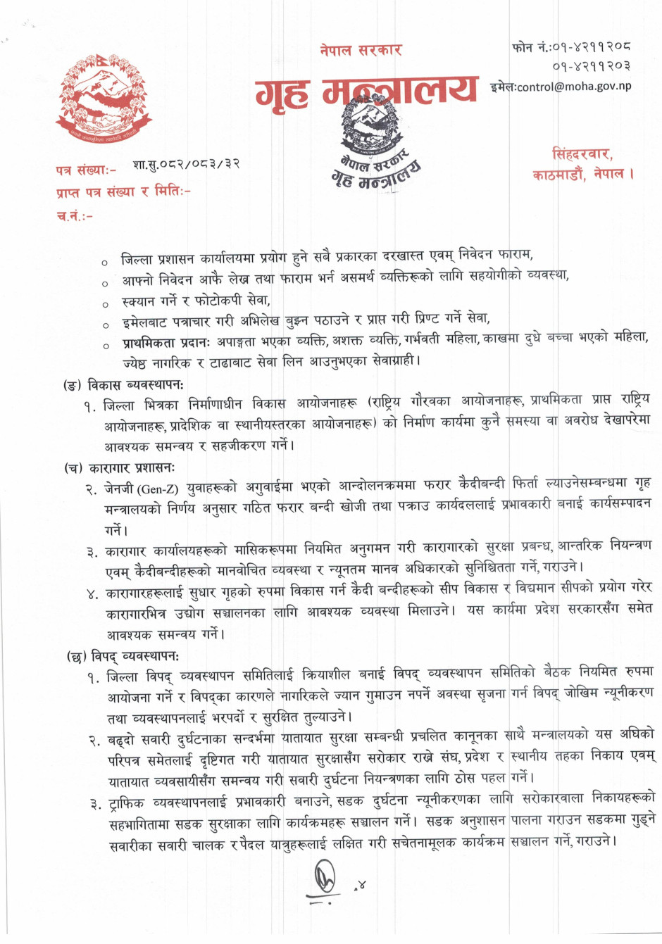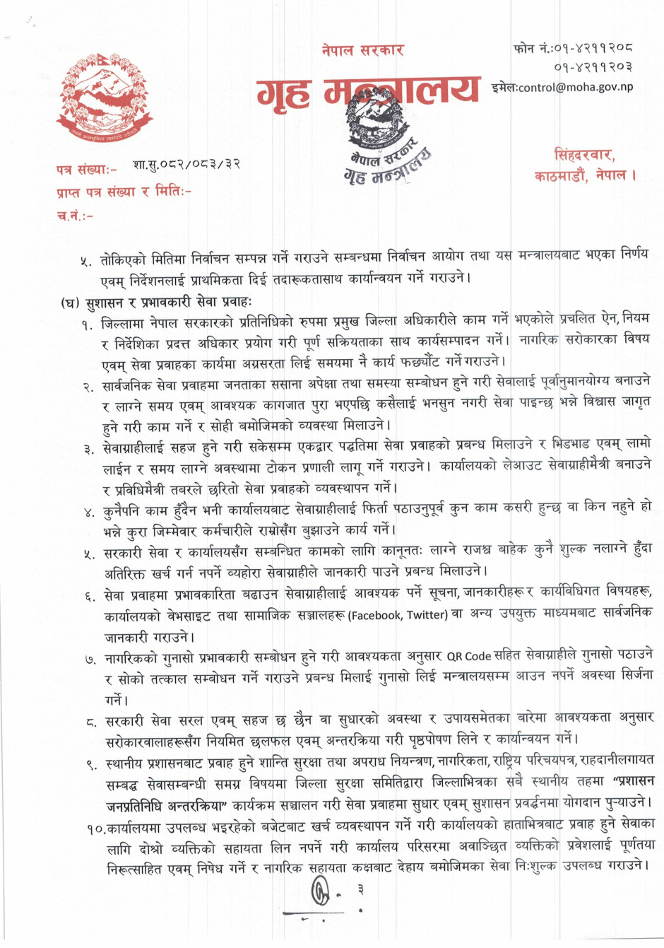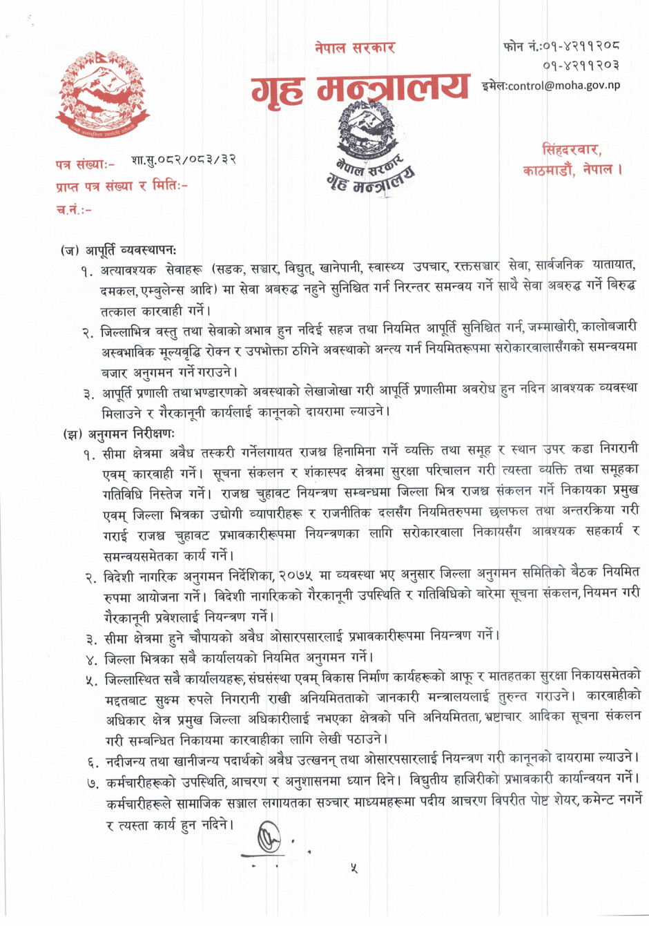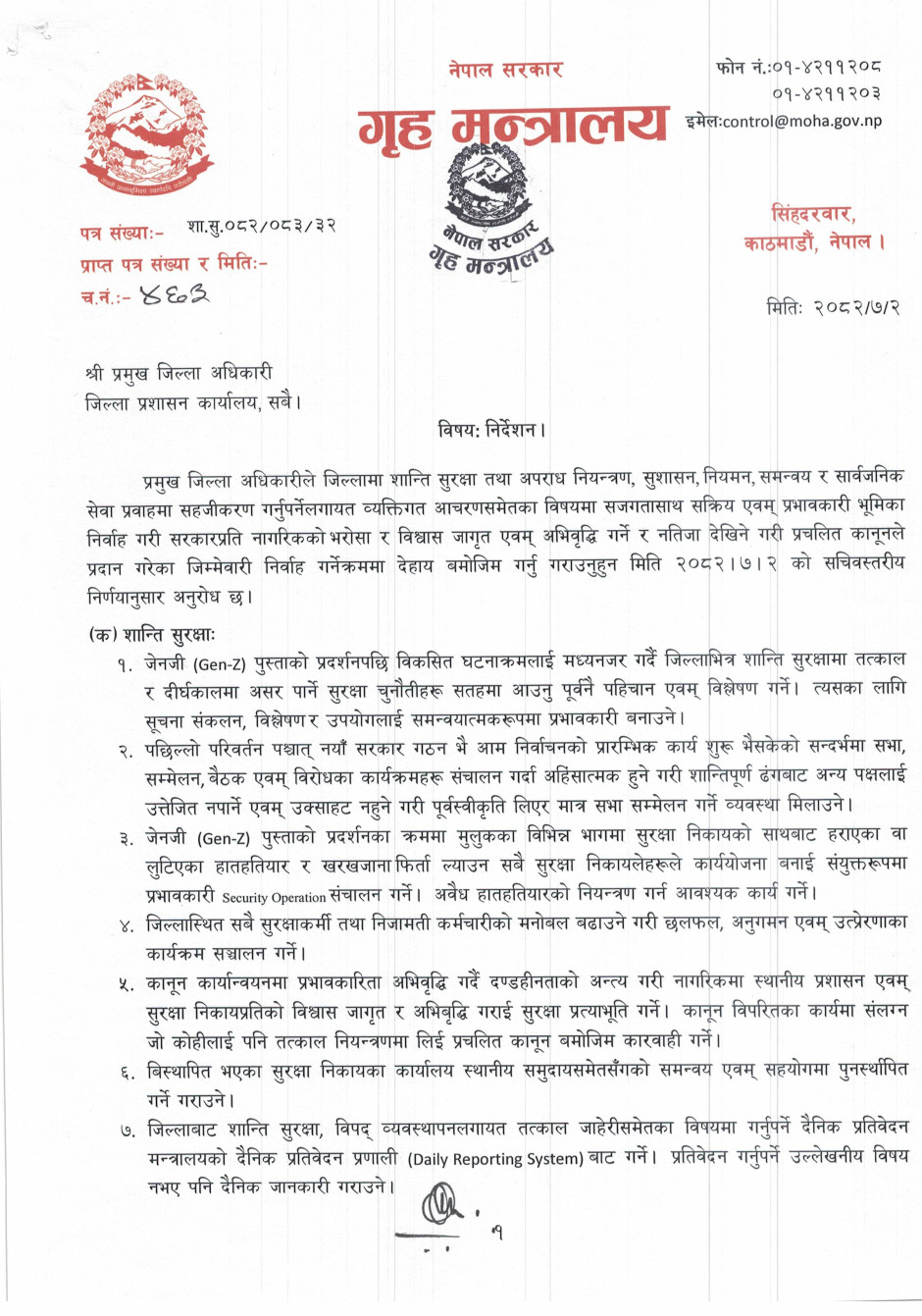 गृहसचिव स्तरीय निर्णयअनुसार जारी गरिएको निर्देशनमा आम नागरिकले महसुस गर्ने गरी शान्ति सुरक्षा र सुशासनको प्रत्याभूति दिलाउन जोड दिइएको छ।