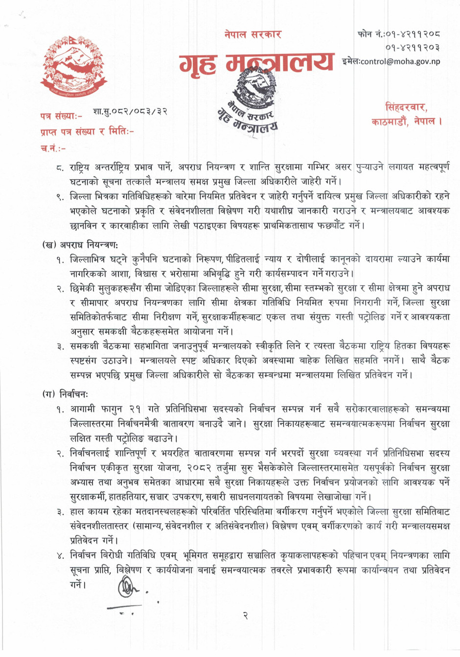 मन्त्रालयले शान्ति सुरक्षा, अपराध नियन्त्रण, सुशासन, सेवा प्रवाह, विपद् व्यवस्थापन, र आसन्न निर्वाचनको तयारीलगायतका विषयमा विशेष निर्देशन दिएको हो ।
