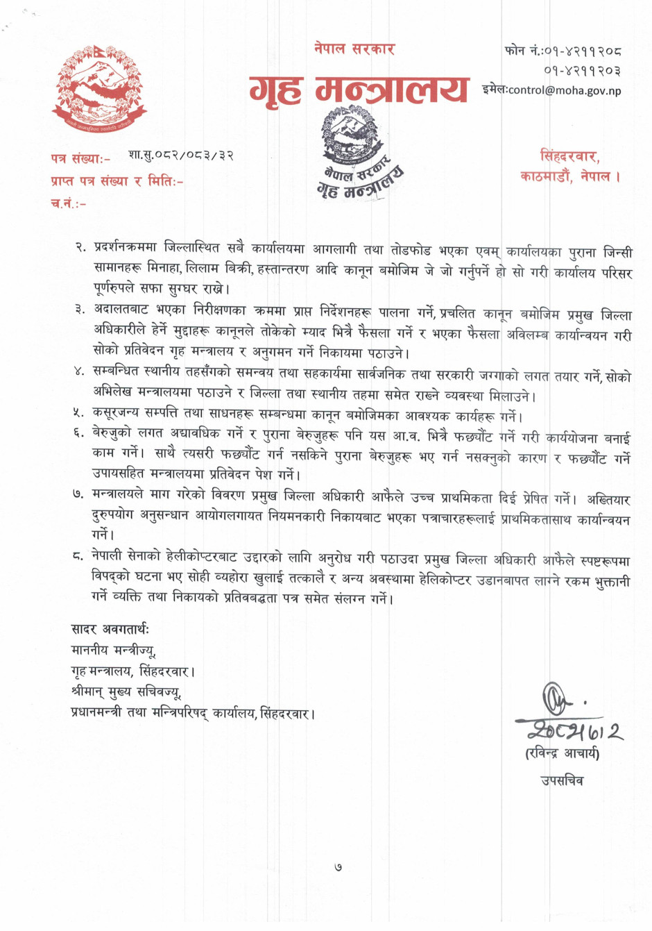 २ कात्तिक, काठमाडौं । गृह मन्त्रालयले सबै जिल्ला प्रशासन कार्यालय (सीडीओ) कार्यालयहरुमा ११ फरक विषयहरूमा विभिन्न निर्देशन दिएको छ ।
