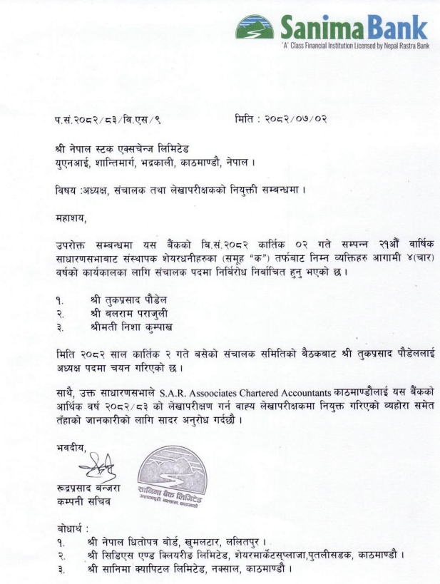 सानिमा बैंकको अध्यक्षमा पौडेल पुनः नियुक्त, सञ्चालकमा पराजुली र कुम्पाख