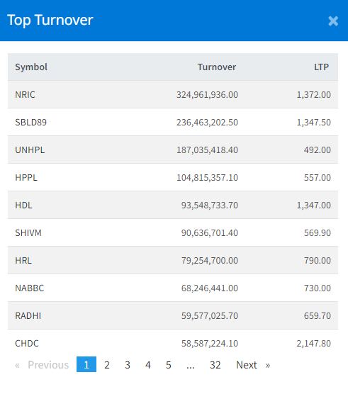 यस दिन ३१३ कम्पनीको ५५ लाख ९६ हजार ७७ कित्ता सेयर किनबेच हुँदा २ अर्ब ६६ करोड १३ लाख ०२ हजार रुपैयाँको कारोबार भएको छ । आज नेपाल पुनर्बीमा कम्पनीको सर्वाधिक कारोबार भएको छ । कम्पनीको यस दिन ३२ करोड ४९ लाख रुपैयाँको कारोबार भएको छ । साथै, आइतबार युनियन हाइड्रोपावरको १८ करोड ७० लाख रुपैयाँ, हिमालयन पावर पार्टनरको १० करोड ४८ लाख रुपैयाँको कारोबार भएको छ ।