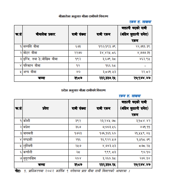 प्राधिकरणका अनुसार जेनजी आन्दोलनमा क्षति भएका सम्पत्तिमध्ये बिमा भएका ६ सय ७३ सम्पत्ति बिमा, २ हजार २ सय ७० मोटर बिमा, इन्जिनियरिङ तथा ठेकेदार बिमा १ सय ९२, परिवहन बिमा १२ र अन्य बिमा ४० गरी कुल ३ हजार १ सय ८७ माग दाबी परेको हो ।