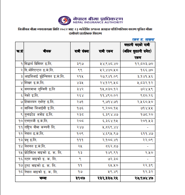 राष्ट्रिय बिमा कम्पनी, नेसनल इन्स्योरेन्स कम्पनी र स्टार माइक्रो इन्स्योरेन्स कम्पनीले कुनै पनि दाबीको अग्रिम भुक्तानी गरेका छैनन् । सबैभन्दा धेरै माग दाबी परेको सिद्धार्थ प्रिमियर इन्स्योरेन्सले एक अर्ब २८ करोड रुपैयाँ अग्रिम भुक्तानी दिएको प्राधिकरणले जनाएको छ ।