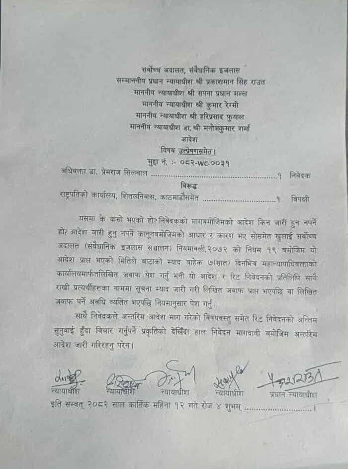 प्रधानन्यायाधीश प्रकाशमानसिंह राउत, न्यायाधीशहरू सपना प्रधानमल्ल, कुमार रेग्मी, हरिप्रसाद फुयाँल र डा मनोजकुमार शर्माको संवैधानिक इजलासले त्यस्तो आदेश दिएको हो । प्रतिनिधिसभा विघटनविरुद्ध परेका रिट निवेदनमा सातदिनभित्र लिखित जवाफ मागसमेत गरिएको छ ।