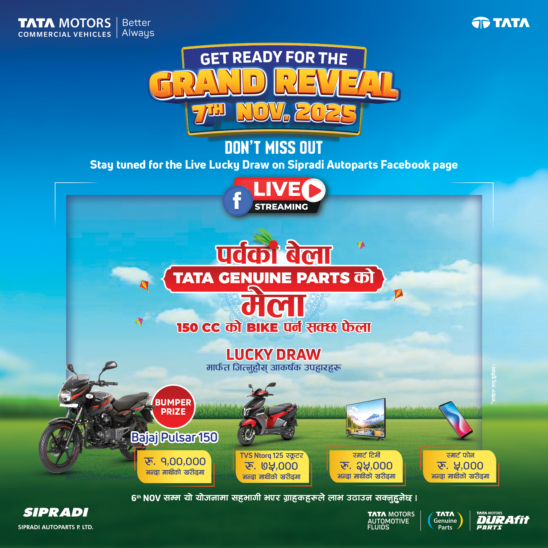 १३ कात्तिक, काठमाडौं । सिप्रदी अटोपार्ट्स प्रा.लि. ले “पर्वको बेला टाटा जेन्युइन पार्ट्सको मेला” अन्तर्गतको बहुप्रतिक्षित लक्की ड्रको ग्राण्ड रिभिल मिति नोभेम्बर ७ (कार्तिक २१ गते) मा गर्ने भएको छ। नोभेम्बर ६ (कार्तिक २० गते) सम्म यो योजनामा सहभागी भएर ग्राहकहरूले विभिन्न आकर्षक लाभ उठाउन सक्नेछन्।