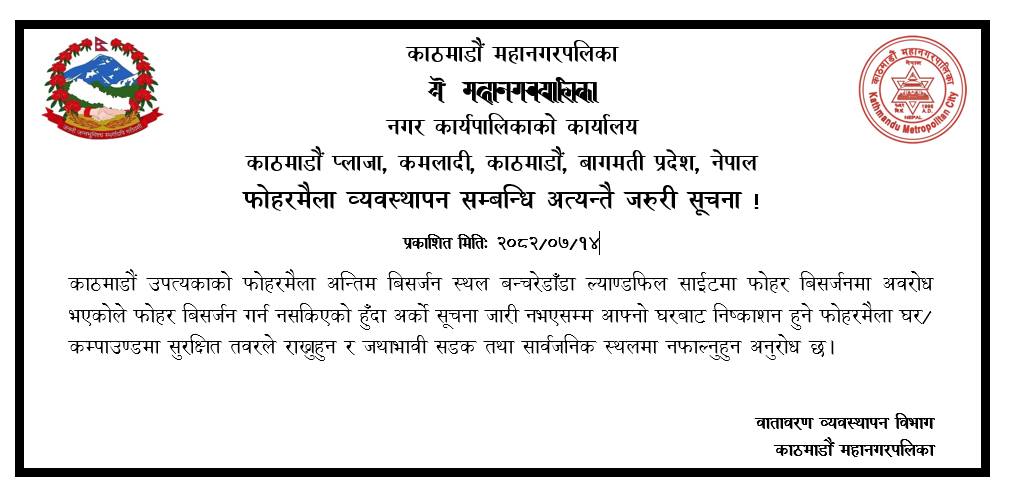 महानगरपालिकालेले आज एक सूचना जारी गर्दै स्थानीयको अवरोधपछि फोहर बिसर्जन गर्न नसकिएकाले अर्को सूचना जारी नभएसम्म आफ्नो घरबाट निष्काशन हुने फोहरमैला घर कम्पाउण्डमा सुरक्षित तवरले राख्न अनुरोध गरेको हो ।