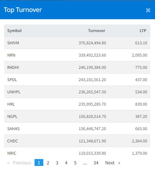 सोमबार शिवम् सिमेन्टको सर्वाधिक कारोबार भएको छ । यस दिन कम्पनीको ३७ करोड ६८ लाख रुपैयाँको कारोबार भएको । त्यस्तै, यस दिन एनआरएन इन्फ्रास्टक्चरको ३३ करोड ९४ लाख रुपैयाँ, राधि बिद्युत कम्पनीको २४ करोड ६१ लाखको कारोबार भएको छ ।