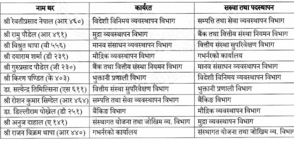 बैंक तथा वित्तीय संस्था नियमन विभागबाट गुरुप्रसाद पौडेललाई मानव संसाधन व्यवस्थापन विभागमा लगिएको छ भने भुक्तानी प्रणाली विभागबाट किरण पण्डितलाई विदेशी विनिमय व्यवस्थापन विभागकाे जिम्मा दिइएको छ। वित्तीय संस्था सुपरिवेक्षण विभागमा रहेका डा. सत्येन्द्र तिमिल्सिना भने भुक्तानी प्रणाली विभाग पुगेका छन्। साथै, सम्पत्ति तथा सेवा व्यवस्थापन विभागबाट रोशन कुमार सिग्देललाई बैंकिङ विभागमा लगिएको छ।