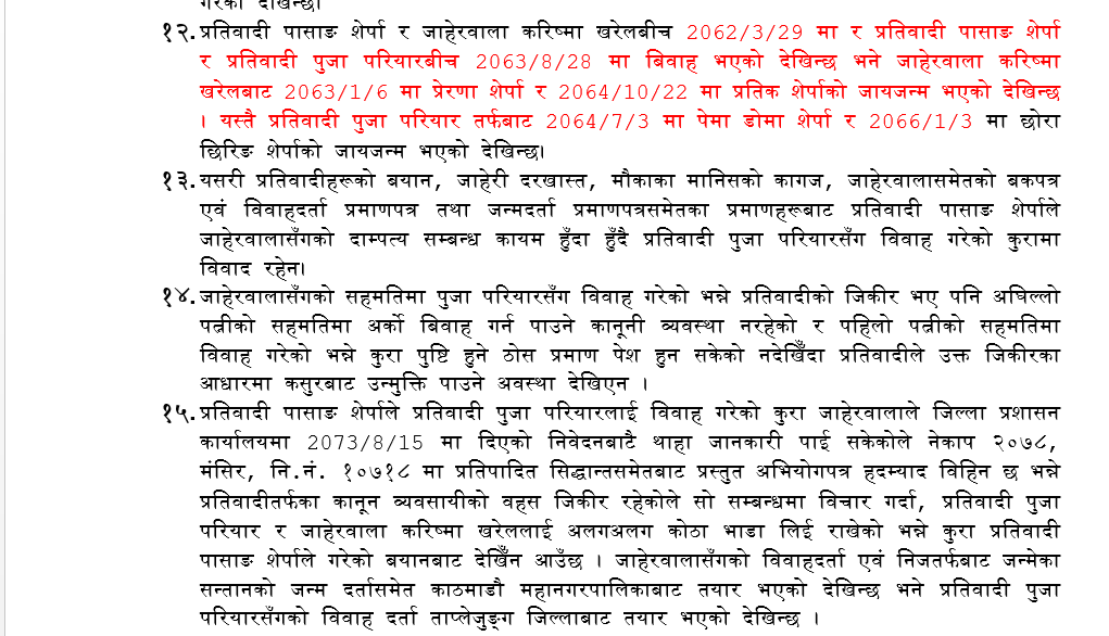 २०८१ असोज ६ मा उच्च अदालतले जिल्ला अदालत काठमाडाैँले २०७९ चैत २३ मा गरेको फैसला सदर गरेको थियो । शेर्पाकी श्रीमती करिश्मा खरेलले शेर्पा र उनकी अर्की श्रीमती पूजा परियारविरुद्ध जिल्ला अदालत काठमाडाैंमा बहुविवाह मुद्दा दायर गरेकी थिइन् । साे मुद्दामा जिल्ला अदालतले पासाङ शेर्पा र करिश्मा खरेलबीच २९ असार २०६२ मा र पासाङ शेर्पा र पूजा परियारबीच २८ मंसिर २०६३ मा विवाह भएको ठहर गरेको थियो । जिल्लाको फैसलामा भनिएको छ, ‘पासाङ शेर्पाले निजकी पत्नी यी जाहेरवालासँगको दाम्पत्य सम्बन्ध कायम रहेकै अवस्थामा पूजा परियारसँग विवाह गरी मुलुकी ऐन बिहेबारीको महलको ९ नम्बरको कसुर गरेको देखिँदा निजलाई ऐ. को दफा १० बमोजिम १ वर्ष कैद र रु. ५ हजार जरिवाना हुने ठहर्छ ।’