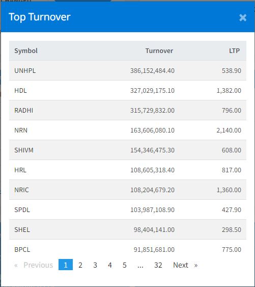 बुधबार यूनियन हाइड्रोपावरको सेयर सर्वाधिक कारोबार भएको छ । आज कम्पनीको ३८ करोड ५५ लाख ४५ हजार रुपैयाँ बराबरको कारोबार भएको छ । त्यस्तै, हिमालयन डिस्टीलरीको ३२ करोड ५३ लाख ४४ हजार रुपैयाँ, राधि विद्युत कम्पनीको ३१ करोड ५७ लाख रुपैयाँ, एनआरएन इन्फ्रास्टक्चरको १६ करोड ३६ लाखकाे खरिद बिक्री भएको छ ।