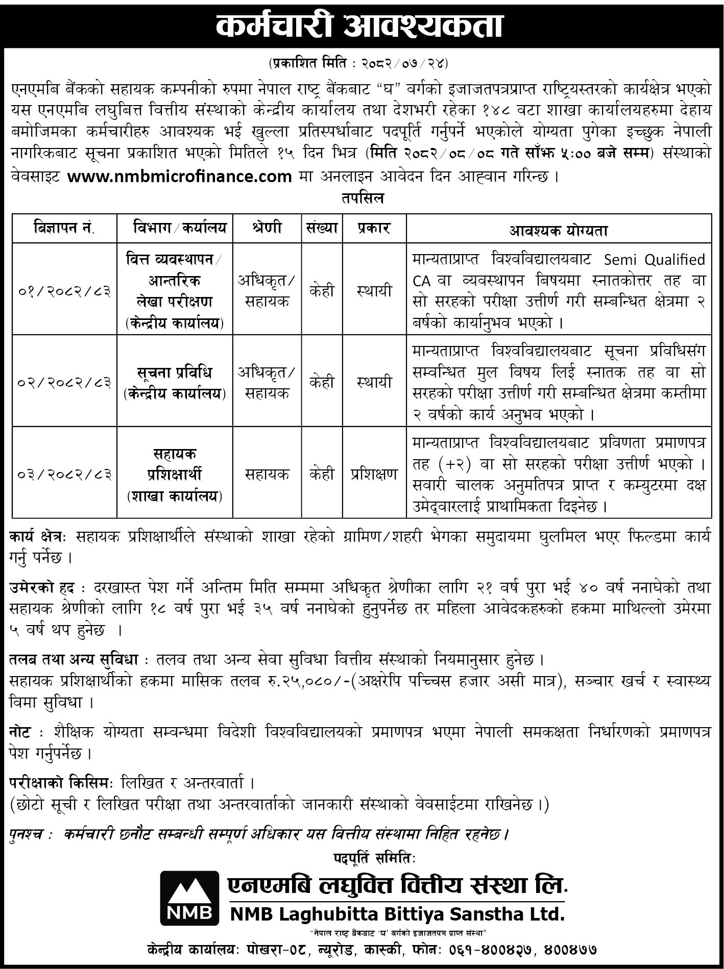कम्पनीले वित्त ब्यवस्थापन आन्तरिक लेखा परीक्षण, सूचना प्रविधि र सहायक प्रशिक्षार्थीका लागि कर्मचारी माग गरेको हो । इच्छुकले आवश्यक कागजात संकलन गरी मंसिर ८ गतेसम्म कम्पनीको बेवसाइट https://nmb.com.np/career मार्फत आवेदन दिन सक्नेछन् ।