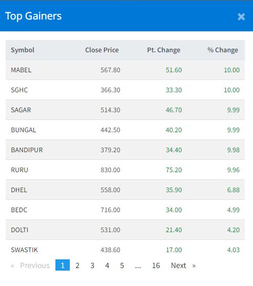 बिहीबार ३२९ कम्पनीको ७६ लाख ५ हजार ५८४ कित्ता सेयर किनबेच हुँदा ३ अर्ब ४९ करोड ९८ लाख २१ हजार रुपैयाँको कारोबार भएको छ । यस दिन ५ कम्पनीकाे सेयरमा सकारात्मक सर्किट लाएको छ । मालिबुङ इनर्जी, श्वेतगंगा हाइड्रोपावर, सागर डिस्टीलरी, बुङ्गल हाइड्रो र बन्दीपुर केवलकारको सेयरमा यस दिन सकारात्मक सर्किट लाएको छ ।