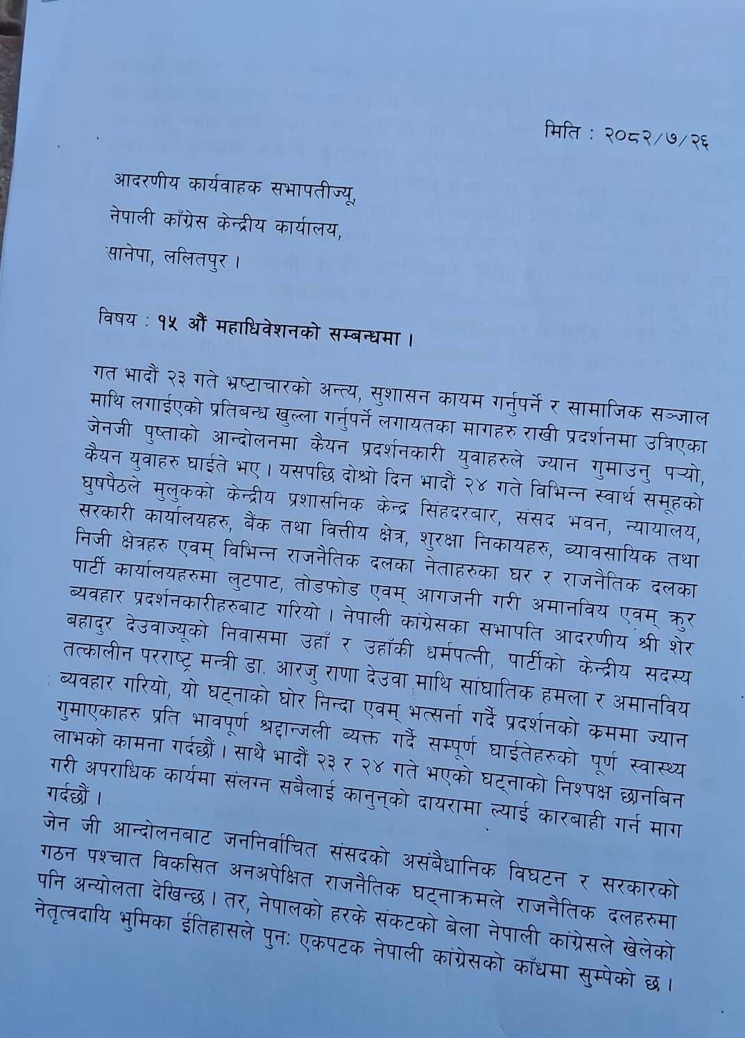 ज्ञापनपत्रमा भनिएको छ, ‘आसन्न २०८२ साल फागुन २१ गतेको निर्वाचनलाई परिणाममुखी बनाउन पार्टीको विधान बमोजिम २०८२ साल मङ्सिर महिनाभित्र १५ औँ महाधिवेशन प्रारम्भ गरी तहगत रूपमा अधिवेशन सम्पन्न गर्नका लागि कार्यतालिका बनाई लागु गर्ने ।’