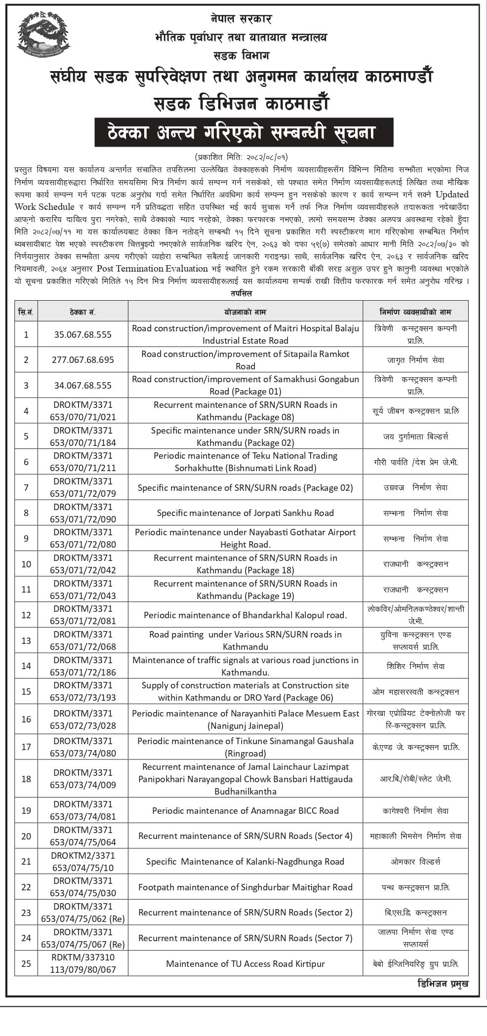 सडक डिभिजन कार्यालय काठमाडौंले ताेड्याे २५ रुग्ण ठेक्का