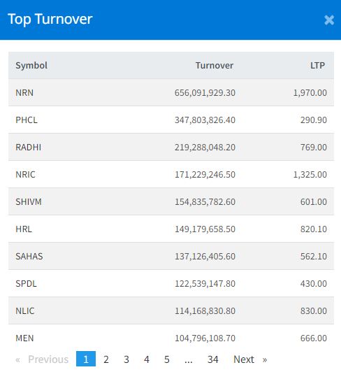 आज एनआरएन इन्फ्रास्टक्चरको सर्वाधिक कारोबार भएको छ। त्यस्तै, यस दिन पिपुल्स हाईड्रोपावर, राद्यी जलविधुत, नेपाल पुनर्बीमा, शिवम सिमेन्टस, हिमालयन रि, साहस उर्जा, सिनर्जी पावर, नेपाल लाइफ र माउन्टेन इनर्जीको सवर्जाधिक कारोबार भएको छ।