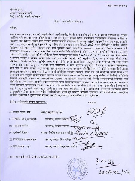 जेनजी आन्दोलनपछि जसपामा नीति, सिद्धान्त तथा माग मुद्दाहरू मिल्ने राजनीतिक दलसँग एकीकरण, मोर्चा, तालमेल गर्ने निर्णय केन्द्रीय कार्यकारिणी समितिलाई दिइएकोमा बैठक नै नबोलाएर अनिर्णित बनाइएको संघीय परिषद् अध्यक्ष श्रेष्ठसहित ६ नेताले हस्ताक्षर गरेको जानकारी पत्रमा उल्लेख छ ।