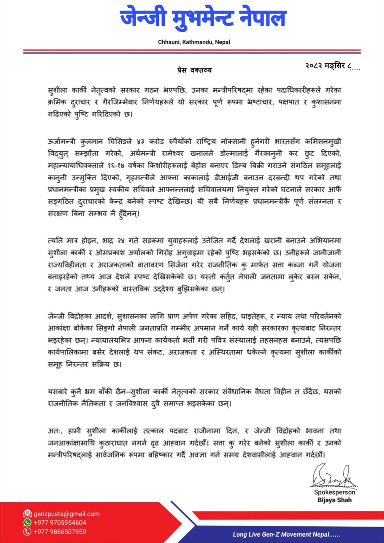 जेन्जी मुभमेन्ट नेपालले सोमवार प्रेस विज्ञप्ति जारी गर्दै ऊर्जामन्त्री कुलमान घिसिङले भारतसँग गरेको विद्युत् सम्झौताबाट ४३ करोड रुपैयाँ बराबरको आर्थिक नोक्सानी भएको, अर्थमन्त्री रामेश्वर खनालले डोल्मा नामक कम्पनीलाई गैरकानुनी कर छुट दिएको, महान्यायाधिवक्ता सबिता भण्डारी डिम्ब तस्करी प्रकरणमा मुछिएको, गृहमन्त्री ओमप्रकाश अर्यालले काका नाता पर्नेलाई सशस्त्र प्रहरीको डीआईजी बनाउन दरबन्दी थपेको र प्रधानमन्त्रीका प्रमुख स्वकीय सचिव आदर्श कुमार श्रेष्ठले आफ्नन्तलाई सचिवालयमा नियुक्त गरेको आरो लगाएको छ ।