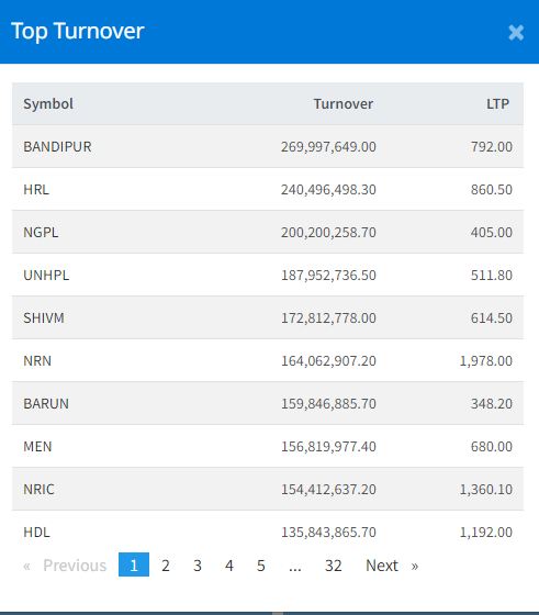 यस दिन बन्दीपुर केवलकारको सेयर सर्वाधिक कारोबार भएको छ । आज कम्पनीको २६ करोड ९९ लाख ९७ हजार रुपैयाँ बराबरको कारोबार भएको छ । त्यस्तै, हिमालयन रिइन्स्योरेन्स कम्पनीको २४ करोड ४ लाख ९६ हजार रुपैयाँ, ङादी ग्रुप पावरको २० करोड २ लाख रुपैयाँ, यूनियन हाइड्रोपावरको १८ करोड ७९ लाख ५२ हजार रुपैयाँ, शिवम् सिमेन्टको १७ करोड २८ लाख १२ हजार रुपैयाँको कारोबार भएको हो ।