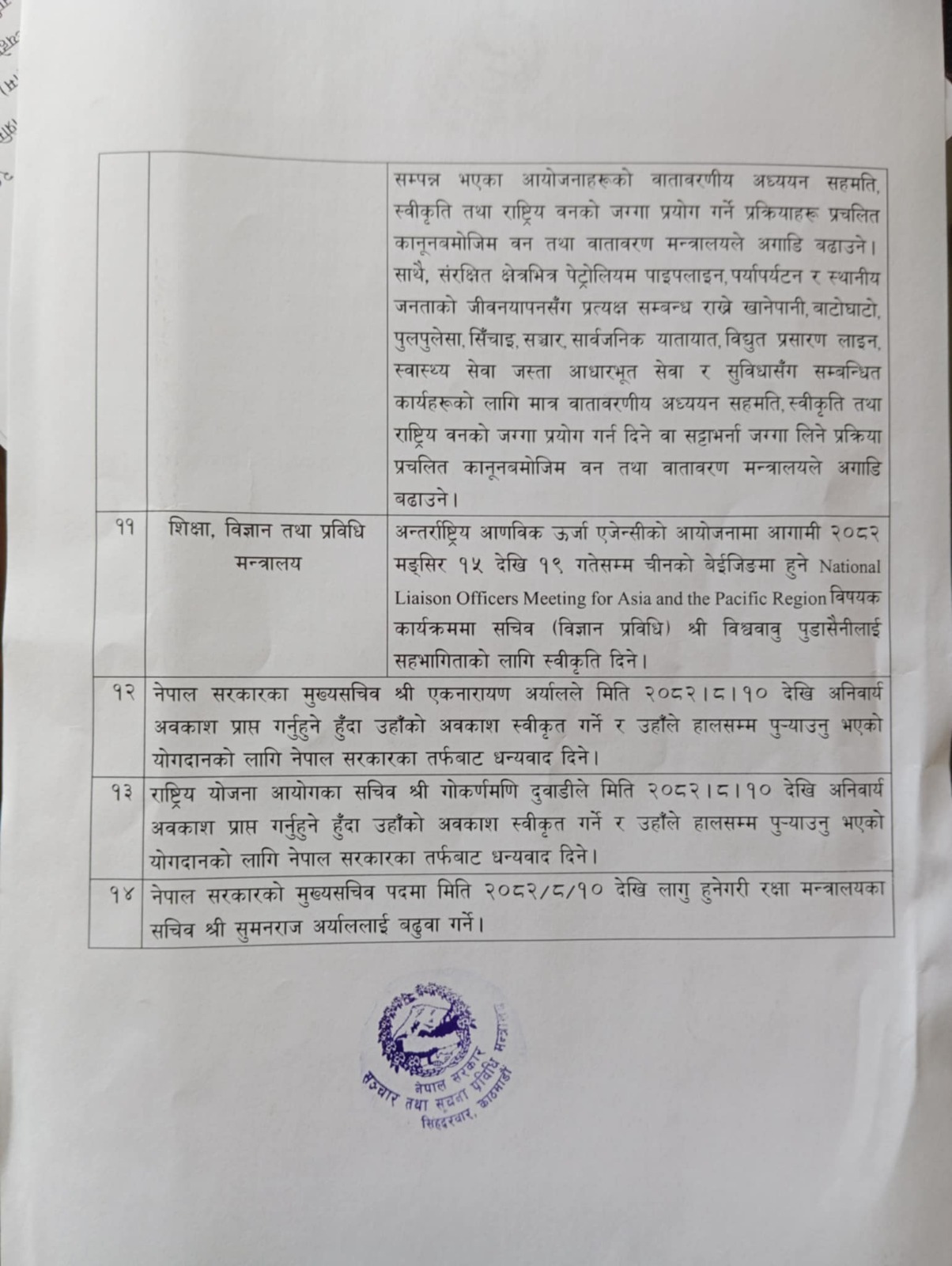 ९ मंसिर, काठमाडौं । सरकारले पछिल्लोपटक बसेको मन्त्रिपरिषद् बैठकका निर्णय सार्वजनिक गरेको छ । सोमबार प्रधानमन्त्री तथा मन्त्रिपरिषद् कार्यालयमा बसेको उक्त बैठकले गरेको निर्णय सरकारका प्रवक्ता एवं सञ्चार, सूचना तथा प्रविधिमन्त्री जगदीश खरेलले सार्वजनिक गर्नुभएकाे हाे ।