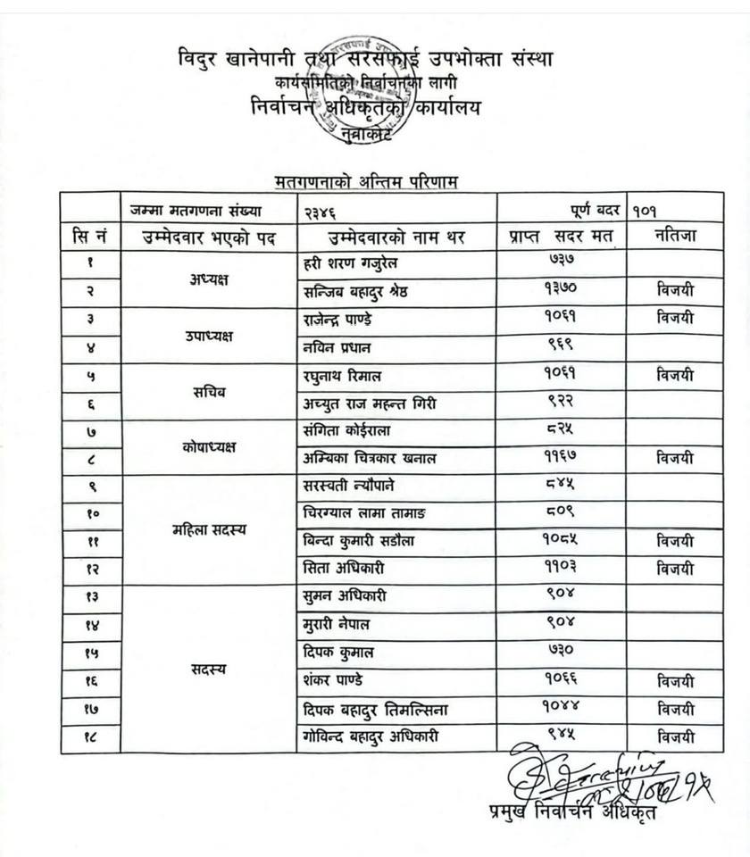 अध्यक्षमा श्रेष्ठले १३७० मत प्राप्त गर्दा गजुरेलले ७३७ मत प्राप्त गर्नुभयो । त्यस्तै उपाध्यक्षमा स्वतन्त्रको राजेन्द्र पाण्डे विजयी हुनुभयो । पाण्डेले १०६१ मत प्राप्त गर्दा प्रधानले ९६९ मत प्राप्त गर्नुभयो । पाण्डे एमालेको विदुर नगर कमिटीको सदस्य हुनुहुन्छ भने प्रधान एमालेको जिल्ला कमिटीको सदस्य हुनुहुन्छ । प्रधान कांग्रेस र एमालेको आधाकारिक प्यानलको उपाध्यक्षको उम्मेदवार हुनुहुन्छ भने पाण्डे स्वतन्त्र प्यानलको उपाध्यक्षको उम्मेदवार हुनुहुन्छ ।