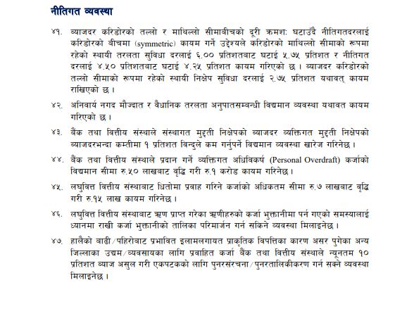 जसअनुसार मौद्रिक उपकरणहरु मध्ये ब्याजदर करिडोरको माथिल्लो सीमाको रुपमा रहेको स्थायी तरलता सुविधा दरलाई ६ प्रतिशतबाट घटाएर ५.७५ प्रतिशत र नीतिगत दरलाई ४.५ प्रतिशतबाट घटाएर ४.२५ प्रतिशत कायम गरिएको छ ।