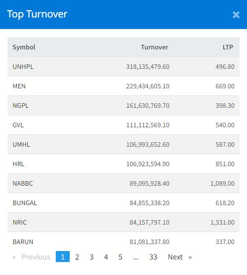 आज ३२४ कम्पनीको १ करोड ८ लाख १० हजार कित्ता शेयर किनबेच हुँदा ४ अर्ब ४८ करोडको शेयर कारोबार भएको हो । यस दिन युनियन हाइड्रोपावरको सर्वाधिक काराेबार भएकाे छ । यस दिन कम्पनीकाे ३१ करोड ८१ लाख रुपैयाँकाे काराेबार भएकाे छ । त्यस्तै, यस दिन माउन्टेन इनर्जीको २२ करोड ९४ लाख रुपैयाँ,ङादी ग्रुप पावरको १६ करोड १६ लाख रुपैयाँ, ग्रीन भेन्चर्सको ११ करोड ११ लाख रुपैयाँ, यूनाइटेड मोदी र हिमालयन रिको १० करोड ६९ लाख रुपैयाँ सेयर कारोबार भएको छ।