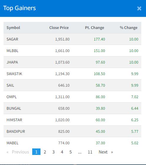 बुधबार ३३२ कम्पनीको १ करोड ८ लाख ७३ हजार ३७२ कित्ता सेयर किनबेच हुँदा ५ अर्ब २३ करोड ५६ लाख ९९ हजार रुपैयाँको कारोबार भएको छ । यस दिन ५ कम्पनीकाे सेयरमूल्यमा सकारात्मक सर्किट लागेकाे छ । यस दिन सागर डिष्टिलरी, मिथिला लघुवित्त वित्तीय संस्था, झापा इनर्जी, स्वस्तिक लघुवित्त वित्तीय संस्था र श्रीनगर एग्रीटेक इन्डष्ट्रीजको सेयरमूल्यमा सकारात्मक सर्किट लागेकाे हाे ।
