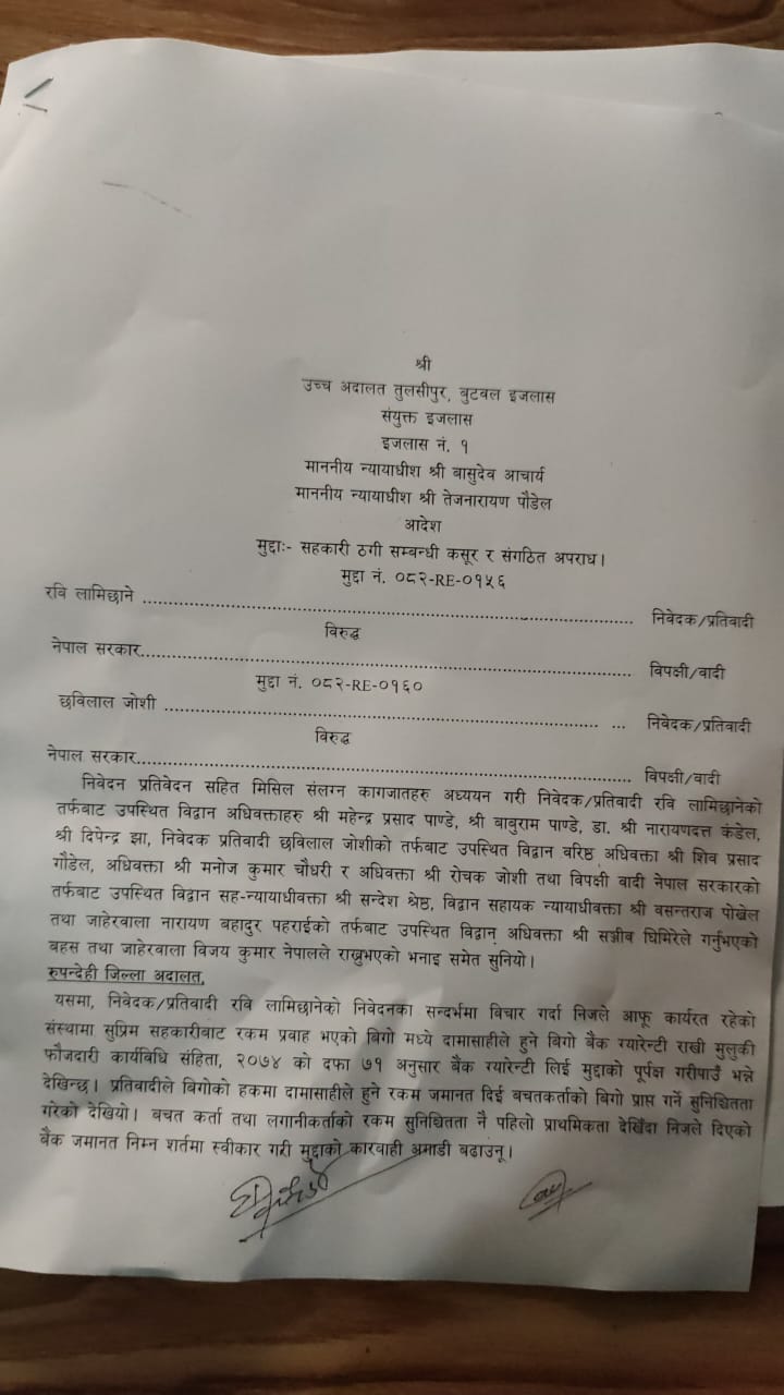 न्यायाधीशद्वय वासुदेव आचार्य र तेजनारायण पौडेलको इजलासले लामिछानेलाई उनले माग गरे अनुसार कै शर्त अनुसार रिहा गर्न आदेश दिएको हाे ।