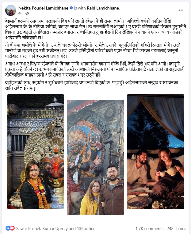 ४ पुस, काठमाडौँ । राष्ट्रिय स्वतन्त्र पार्टीका अध्यक्ष रवि लामिछानेको पत्नि निकिता पौडेलले मध्यरातमा अहिलेसम्मको सद्भाव र समर्थनका लागि सबैलाई नमन गर्नुभएको छ । पति लामिछाने उच्च अदालतको आदेशले शुक्रबार छुट्ने भएपछि निकिताले समर्थन गर्नेहरूमा धन्यवाद व्यक्त गर्नुभएको हो । उहाँले फेसबुकमा रविको अनुपस्थितिमा आफूले गहिरो रिक्तता भोगेको उल्लेख गर्नुभएको छ ।