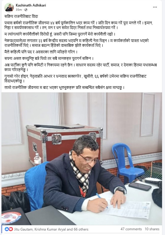 गुनासो गरेर होइन, नेतृत्वप्रति आभार र धन्यवाद ब्यक्तगरेर, खुसीले, ६६ बर्षको उमेरमा सक्रिय राजनीतिबाट विदा भएको छु । लामो राजनीतिक जीवनमा मबाट भएका भूलचुकहरू प्रति सम्बन्धित सबैसँग क्षमा माग्दछु ।