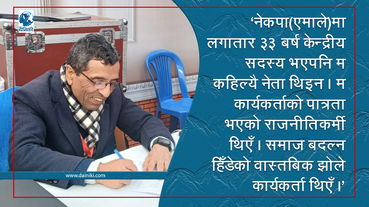 पचास बर्षको राजनीतिक जीवनमा ४४ बर्ष पूर्णकालिन भएर काम गरें । जति दिन काम गरें पुरा मनले गरें । इमान, निष्ठा र समर्पणकासाथ गरें । तन, मन र धन समेत दिएर निसर्त तथा निस्वार्थरुपमा गरें ।